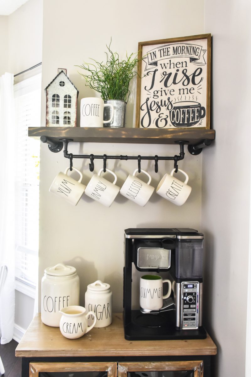 Farmhouse Coffee Bar with DIY floating shelf and mug rack